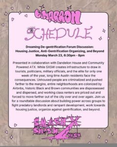 Presented in collaboration with Dandelion House and Community Powered ATX. While SXSW creates infrastructure to draw in tourists, politicians, military officials, and the elite for only one week of the year, long time Austin residents face the consequences. Unhoused people are criminalized and pushed farther to the margins, entire neighborhoods are colonized by Airbnbs, historic Black and Brown communities are dispossessed and dispersed, and working class renters are priced out and forced to move farther out of the city over and over again. Join us for a roundtable discussion about building power across groups to fight predatory landlords and rampant development, work towards housing justice, organize against gentrification, and beyond.