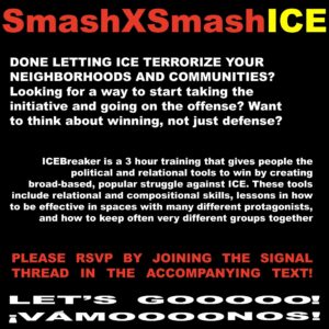 We’ll share these tools, as well as a full array of tactics gleaned from successful anti-ICE networks around the country. We will help participants understand the range of tactics and practice how to select and pivot depending on local contexts, and will discuss common obstacles to present struggles and how they can be concretely overcome. Most importantly, this training, led by experienced organizers who come from a variety of different political backgrounds, develops participants’ confidence in their own agency and ability to intervene. Remember: making people feel powerless is the first step of their plan—don’t let them take away your belief that we can still act!