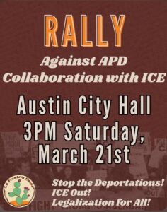 Rally Against APD Collaboration with ICE Event Details Date: March 21, 2026 3:00 pm – 5:00 pm Venue: Austin City Hall Categories: Action