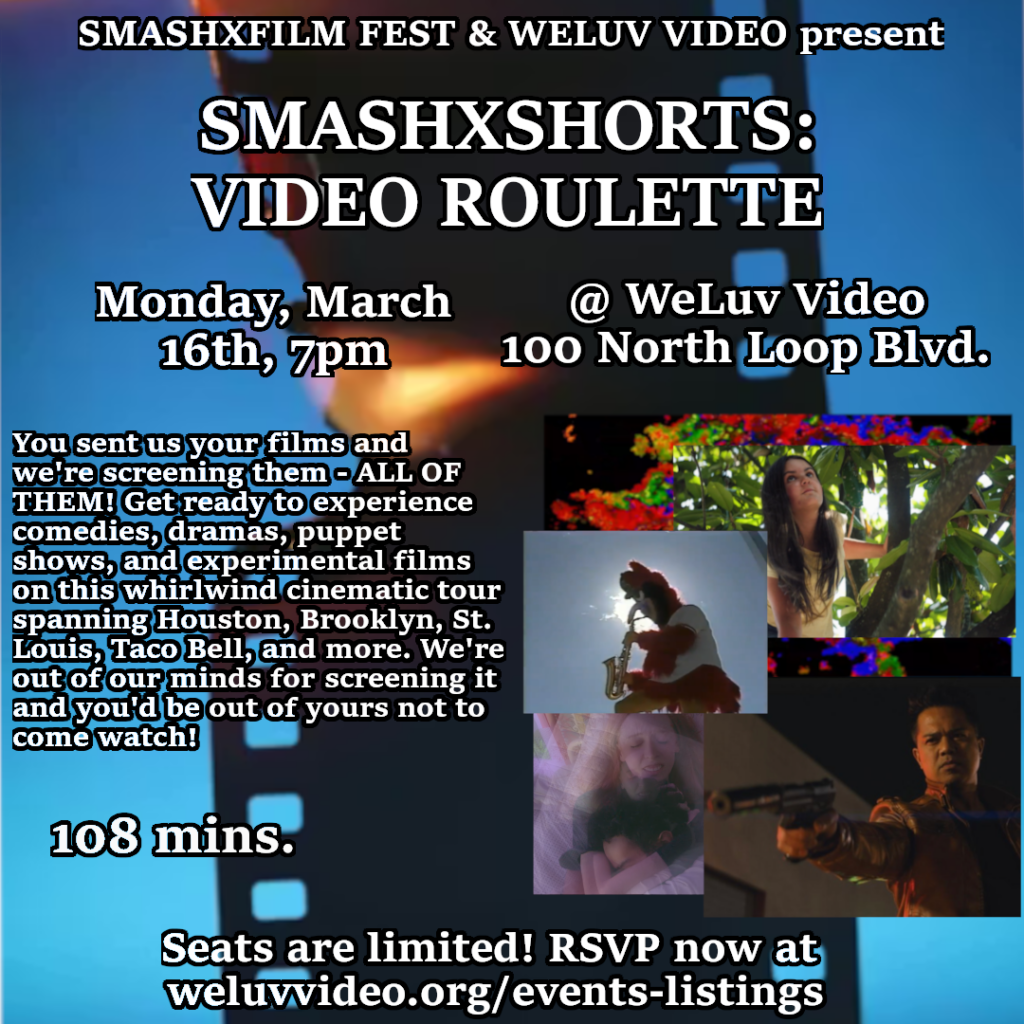 You send us your films and we’re screening them – ALL OF THEM! Get ready to experience comedies, dramas, puppet shows, and experimental films on this whirlwind cinematic tour spanning Houston, Brooklyn, St. Louis, Taco Bell, and more. We’re out of our minds for screening it and you’d be out of yours not to come watch!
